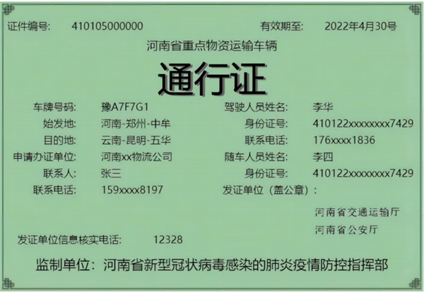 在此,記者提醒還未申領全國統一式樣《通行證》的收(發)貨單位,5月8日前為新老通行證過渡期,企業原申領的《進出河南省疫情防控應急物資運輸車輛通行證》和我省全國統一式樣《通行證》均可有效使用。5月9日起,原《進出河南省疫情防控應急物資運輸車輛通行證》失效,全部申領使用全國統一式樣《通行證》。(記者 王皓萍)