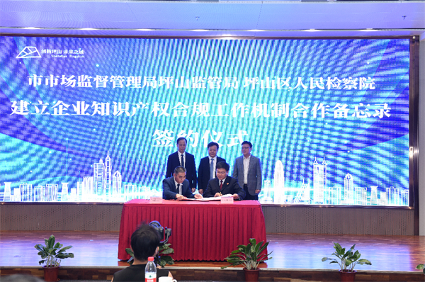 隨後在成果發佈環節,《市市場監督管理局坪山監管局坪山區人民法院 知識產權訴調對接框架協議》《市市場監督管理局坪山監管局 坪山區人民檢察院建立知識產權合規機製備忘錄》以及中國(深圳)知識產權保護中心坪山分窗口揭牌儀式等知識產權工作成果在參會領導的見證下舉行簽約和揭牌。