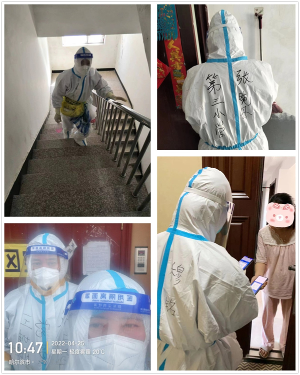 100多名教師志願者們爬樓梯入戶為封控小區居民做核酸,每天從一樓到六樓七樓,一層一層挨門逐戶,錄信息、采核酸、作登記,一趟下來密不透氣的防護服里就已經完全濕透,可他們一走就是六七個單元。為了安全防護服不能脫,因此要儘量避免上廁所就要少喝水,可是一次一次的大汗淋漓讓他們累得虛脫,他們都咬牙堅持。有的老師白天工作了一天,半夜接到任務還會毫不猶豫的再次出征。除了給居民做核酸教師志願者們還會幫助管控單元清理垃圾,給居家住戶運送物資……他們穿梭於各個小區,蹣跚於各個樓層,忙碌在各個重要點位。他們不計得失、不計報酬、不懼危險、不分晝夜,為靜默在家的居民勞苦堅守。深夜裏他們脫掉幾層汗濕又風乾的衣物,馬上抽空兒和家人視頻報平安,屏幕對面的家人看到他們貼在頭上的濕發和臉上口罩留下的勒痕,內心早已破防。