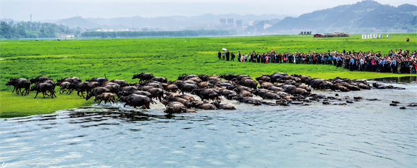 本次活動運用航拍、地面直播設備等先進技術,近距離跟隨百餘頭水牛,橫渡嘉陵江尋水覓食。活動中,隨着柵欄門的開啟,上百頭牛兒沖向嘉陵江中,牛群不時變換隊形,經過數分鐘破浪前行,終於登上水草豐茂的江心太陽島。活動還伴有歌舞表演、非遺產品推介等環節。