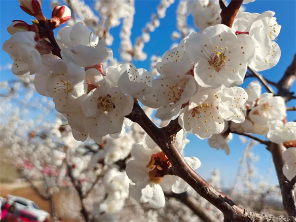 據了解,莊園村百畝杏林已有40年之久的歷史,它的根系源於山中野生杏樹,人工嫁接培育種植,才有如今山連山、樹挨樹的漫山美景。杏花含苞待放時朵朵紅艷,花期10天。