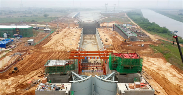 李遠國告訴我們,項目目前主體一期混凝土、上下游靠船墩已全部施工完成;上游導航牆二層牆身澆築18塊,完成比例93.4%;下游導航牆一層牆身澆築13塊,二層牆身完成7塊,完成比例65%;導流牆牆身完成14段,完成比例77.8%。跨閘公路橋灌注樁、墩柱全部完成,第五聯現澆箱梁已澆築完成。預製塊護坡完成12.4萬平,完成比例79.4%。主體三角門頂底樞、閘室浮式繫船柱槽等二期混凝土全部完成,三角門、閥門啟閉機正在安裝,預計5月底實現閘門開合功能。