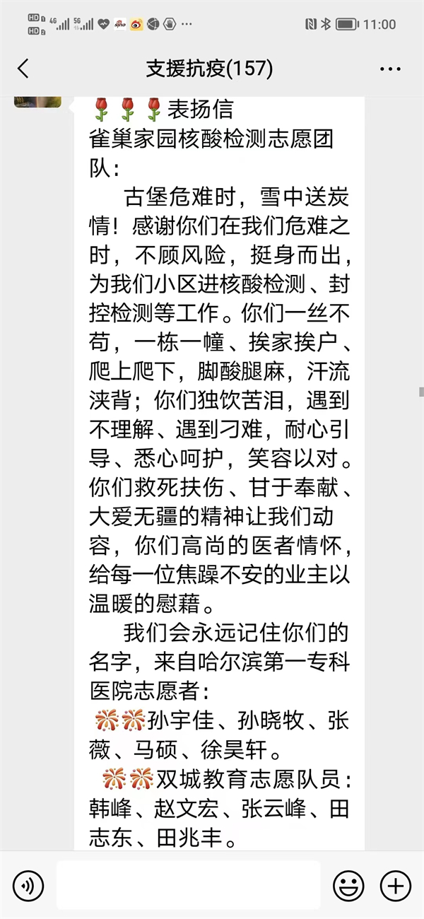 他們果敢衝鋒的抗疫精神感染着哈爾濱市援雙醫護工作者,感動着小區居民與包保單位的工作人員,哈爾濱市醫護志願者、鑫晟家園和雀巢家園等小區的居民、雙城區人民檢察院紛紛發來了表揚信,打來了慰問電話,分別對老師們嫻熟的業務能力表示肯定,對他們的辛苦付出致以敬意。(記者 張曉磊 王立春 王勇)