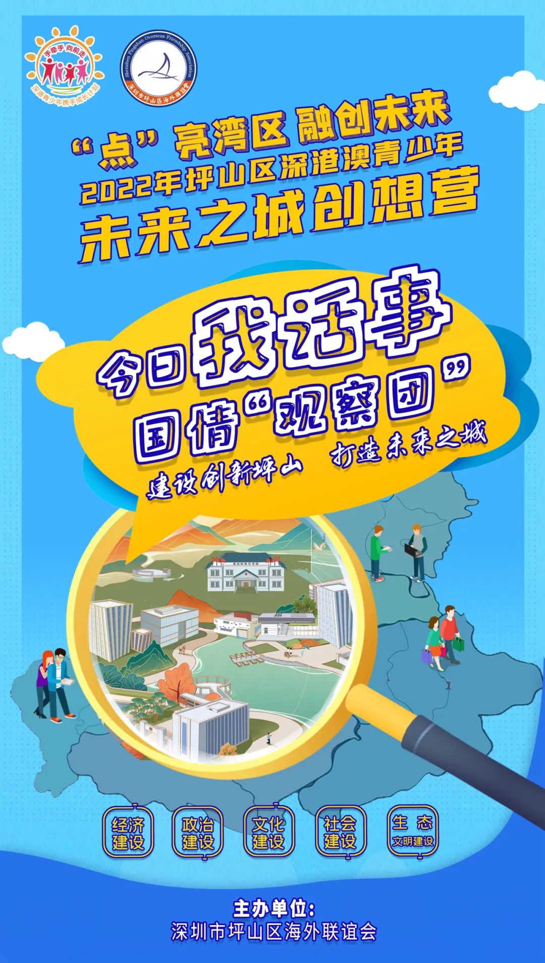 為迎接香港回歸祖國25周年,進一步推動促進深港澳青少年聯誼交流做深做細做實,深入開展港澳青少年國情教育,深圳市坪山區創新開展「手牽手 向前走」——深港澳青少年攜手成長計劃系列活動之「『點』亮灣區·融創未來」2022年坪山區深港澳青少年「未來之城創想營」系列活動。