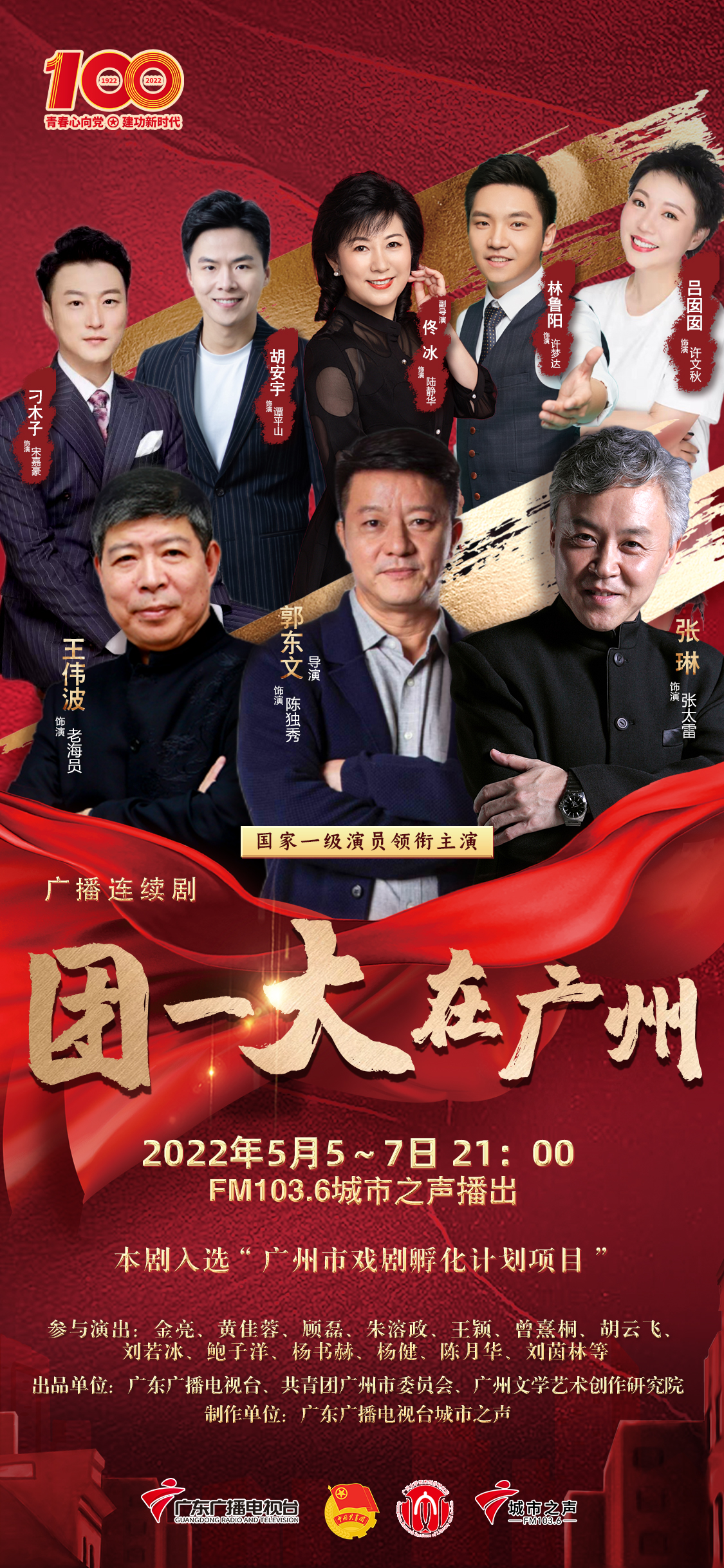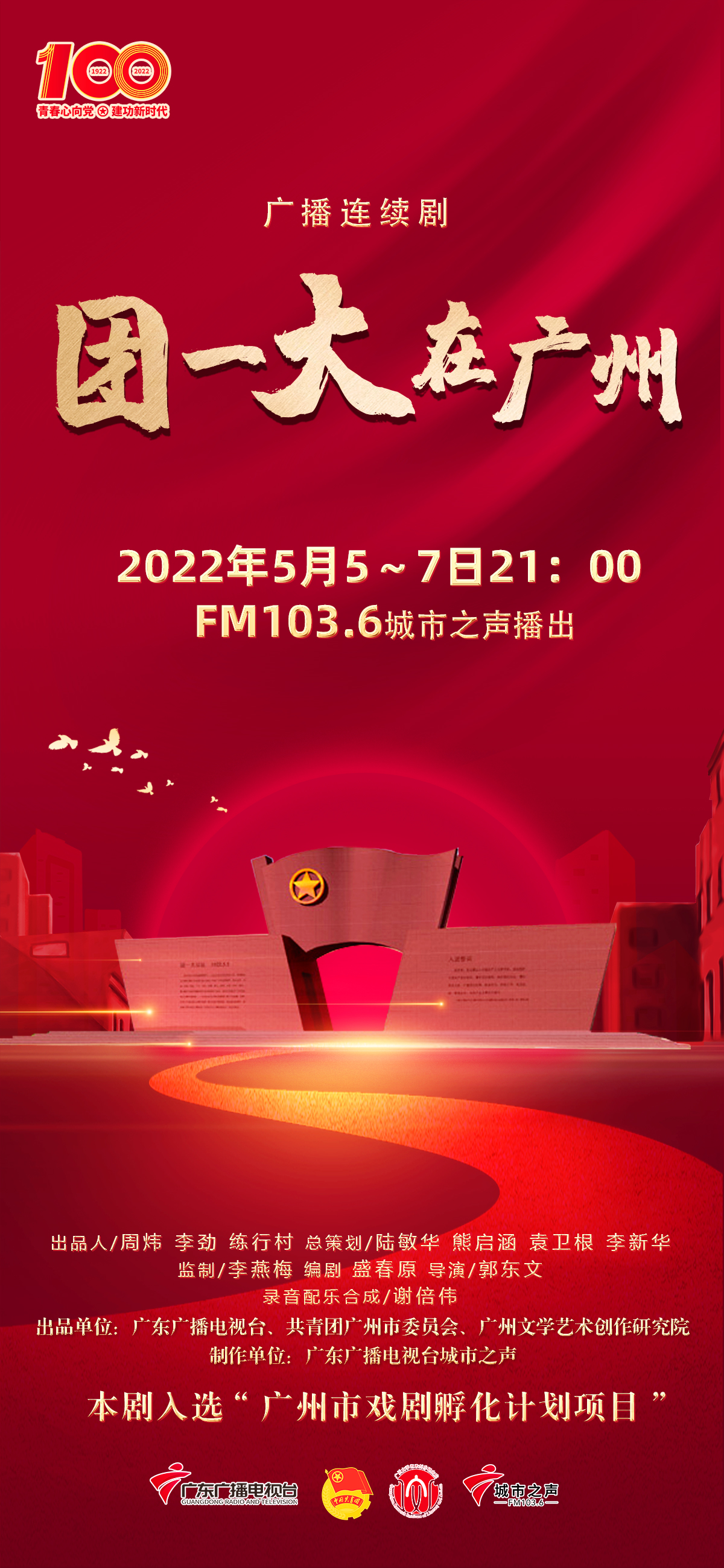 今年是中國共青團成立100周年。由廣東廣播電視台、共青團廣州市委員會、廣州文學藝術創作研究院聯合出品,國家一級演員領銜傾情演繹的廣播劇《團一大在廣州》將重磅推出。該劇真實還原團一大召開的歷史背景和過程,展現了一代青年的遠大理想和愛國情懷,以及100年前青年團在黨的領導下發動青年運動,帶領廣大青年為國家為民族鬥爭的壯闊歷史。三集廣播連續劇《團一大在廣州》將於5月5日—7日,每晚21:00在FM103.6廣東廣播電視台城市之聲播出。