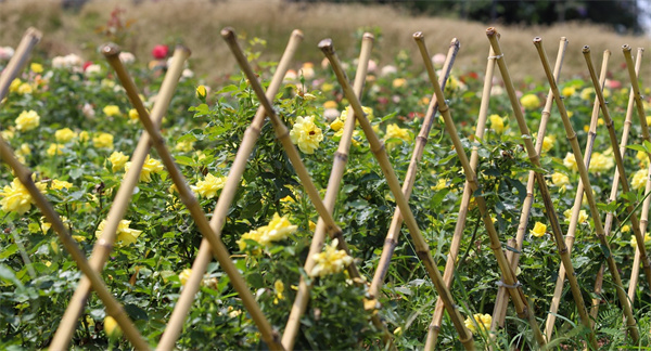 據了解,橋頭荷花文旅產業園七彩花田大型愛心玫瑰園種植的玫瑰是大樹玫瑰和大花玫瑰,共18000株,種植面積有6畝,其中大花玫瑰有香水黃、狀元紅、和平、黑玫瑰、緋扇、大頭黃、流星雨、白聖誕、歐月、巴黎玫瑰、芳純等品種。據花農介紹,大花玫瑰能做到終年不斷花,開花一茬接一茬,被譽為是花卉界的「小蜜蜂」。目前,園內的玫瑰花正處於盛花期,大家既可遠觀花海,可感受參差錯落的花境之美;也可穿梭其中,近距離欣賞玫瑰花的種種妖嬈姿態,聞聞玫瑰花香。