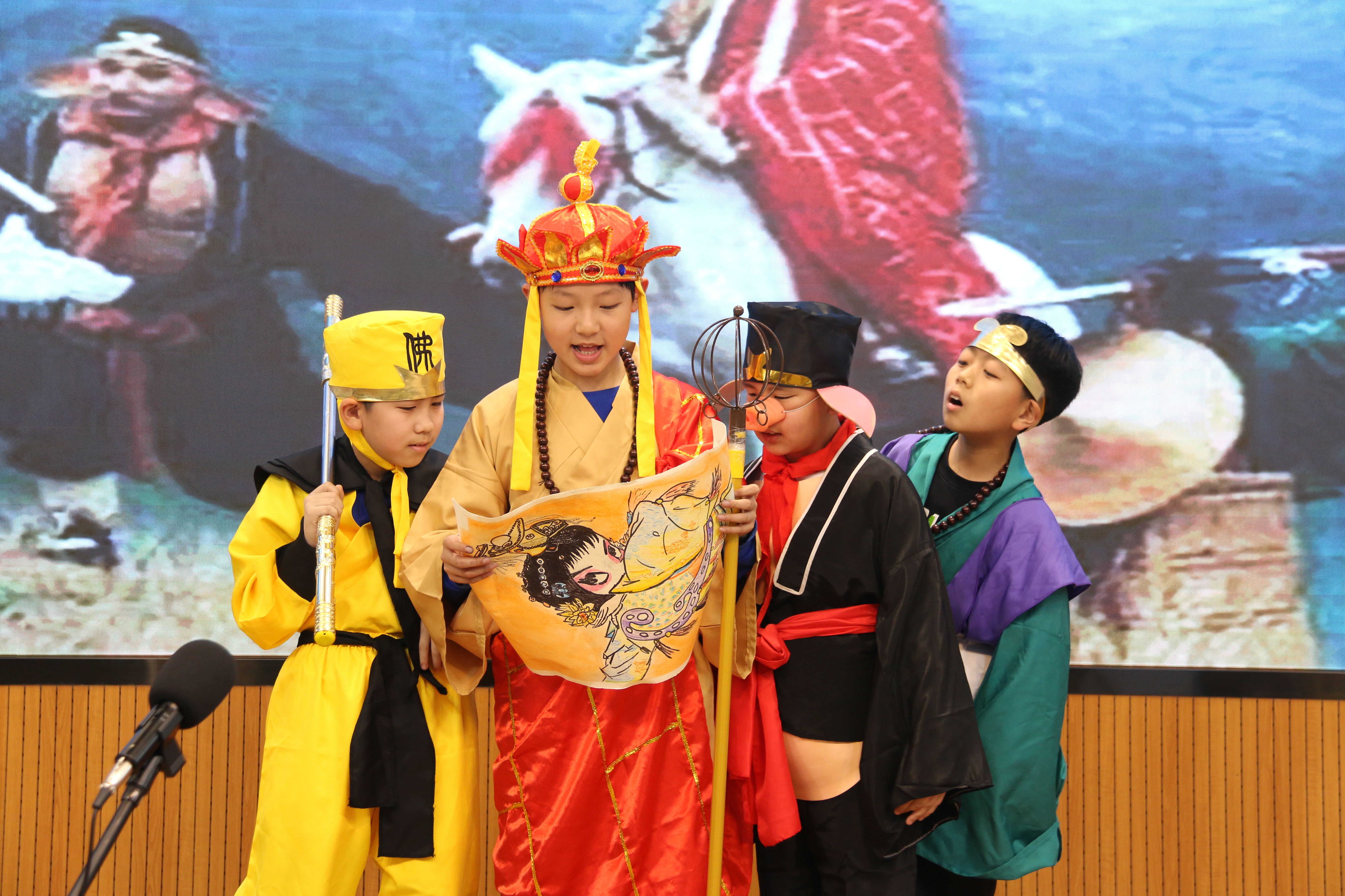 “為國殺敵是代代出英賢,這女子們哪一點不如兒男……”現場的同學們正表演劇碼《木蘭從軍》,他們把花木蘭女扮男裝,替父從軍盡孝的故事演繹的惟妙惟肖。
