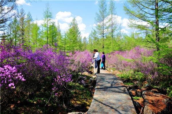 五大連池世界生物圈保護區位於黑龍江黑河市境內,大小興安嶺與松嫩平原的過渡地帶。每到冰雪消融的春季,在熔岩縫隙上、樹木旁,一簇簇粉紅在春風中競放。來這裏不僅可以徒步賞花,還能乘船遊石龍河水上風光、觀溫泊,遊龍門石寨、黑龍山、鐘靈寺等景點。