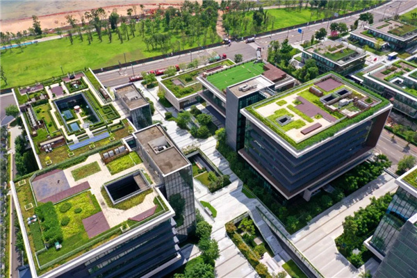 探訪其間,這裏的每一棟樓頂都有屋頂花園。建築的至高處是「天空運動場」。建築的外立面栽種了本土植物油麻藤形成垂直綠化,形成獨特的「植物遮光簾」,還有迷你天空農場。隨便打開一間辦公室就能縱享4500畝的興隆湖景。