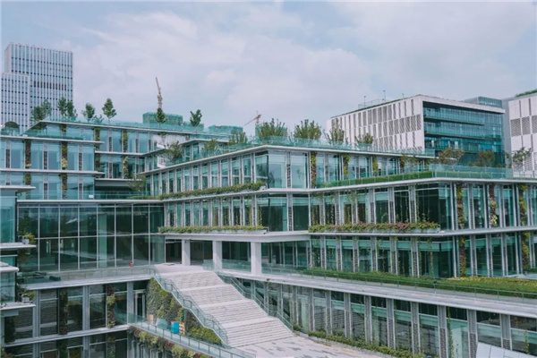 位於成都興隆湖畔,8000多平方米的屋頂花園,87%的功能房間能夠達到自然採光標準,外立面掛滿綠色植物,這就是成都首個「近零碳建築」——中建濱湖設計總部(中建低碳智慧示範辦公大樓)。