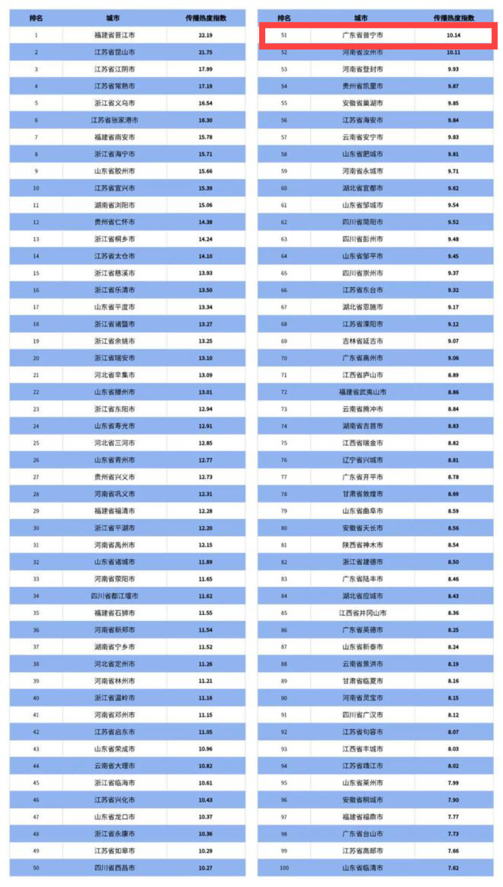 普寧市以10.14的傳播熱度指數排在全國縣級市傳播指數前100榜單的51位,名列廣東省內第一,足見普寧市近年來在城市核心競爭力與城市品牌效應方面的提升。(記者 莊志彬 陳彥潔)