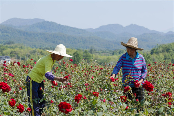 初夏時節,徽州區潛口鎮墨紅玫瑰種植基地裏,大片的鮮紅的玫瑰迎風綻放,絢麗多彩,花香四溢。“我們在這裏種植、管理、採摘,工錢是按照小時計算,一天80-100元左右,一年下來有一兩萬收入,收入還是可觀的”。5月10日上午,记者在墨紅玫瑰種植基地看到,徽州區潛口鎮坤沙村村民汪貴珍正和其他村民一起,在基地裏忙著採收盛開的墨紅玫瑰。