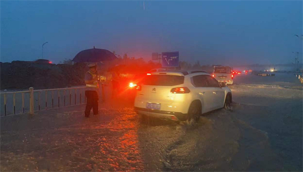 新會區交警大隊雙水中隊正疏導大面積水浸行車緩慢車輛