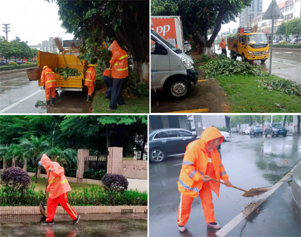5月11日,在雨勢較小時,蓬江區環衛工人抓緊時間對市區主次幹道、背街小巷進行路面排險清理,及時處理井口倒灌、井蓋移位等情況,減少市民出行的安全隱患。