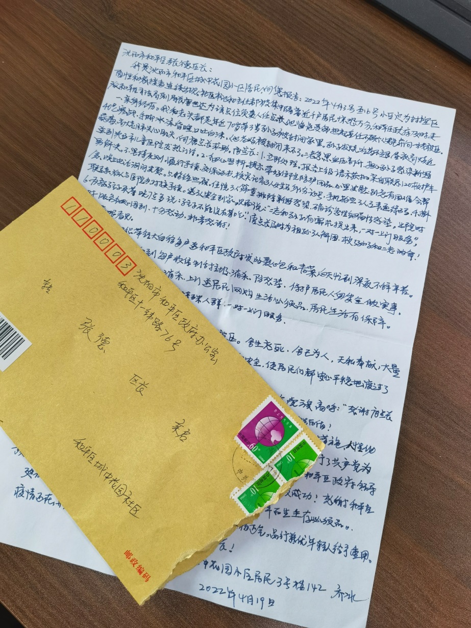 近日,一封貼着郵票的手寫地址的信,被送到瀋陽市和平區政府區長的手上。信封面的落款是和平區城中花園社區,信的內容洋洋灑灑足有千字,字跡清晰,條理清楚,把記憶拉回了城中花園居民「封控」的那段日子。