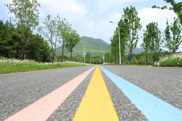 沿線設有「甜蜜的愛情之門」「愛你一世一生」等特色打卡點,道路兩旁多年生混播草花競相綻放,道路中間的「彩虹線」與沿途風景交相輝映,「車在景中行,人在花中游」,一路徜徉的遊客好似開啟了一場尋覓愛情的浪漫之旅。