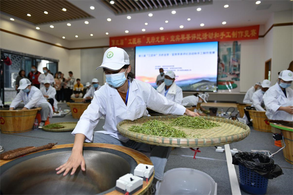 據介紹,競賽選用鮮葉均為一芽一葉,每位選手需要按照規定完成捲曲形茶的製作。預熱、洗鍋、殺青、揉捻……一場比賽的時間長達一個半小時。在賽場上不僅能與同行進行了經驗交流,還能看到各企業的技能展示。
