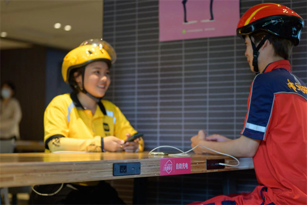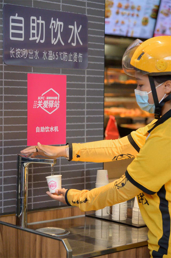 「關愛驛站非常體貼暖心。」日常在福田片區送外賣的美團騎士長羅在燕感嘆到,「之前有時遇到很急的情況,其實也會來肯德基尋求一下幫助,店員都很友好。現在天氣也漸漸熱了,有了這類關愛驛站,能在這裏休息一下,還會給我們提供一些口罩之類的用品應急,真挺好的。」
