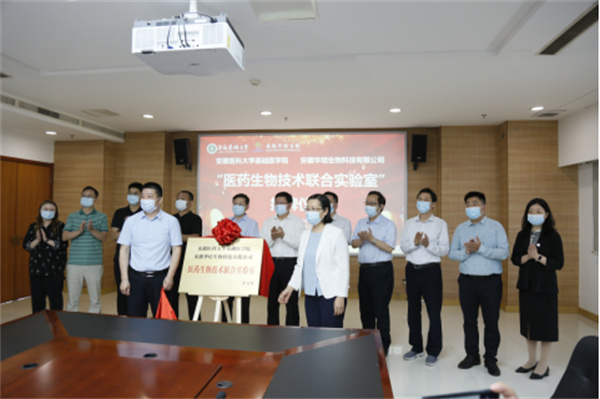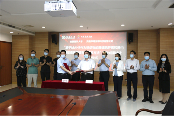 當天,華培生物科技總經理范傳華與安徽醫科大學副校長呂雄文簽署了《「基於MANF作為標記物的肝細胞肝癌和肝內膽管細胞癌鑑別產品及方法」科技成果轉讓合同》,雙方簽訂院企產學研合作協議,並舉行「醫藥生物技術聯合實驗室」揭牌儀式。