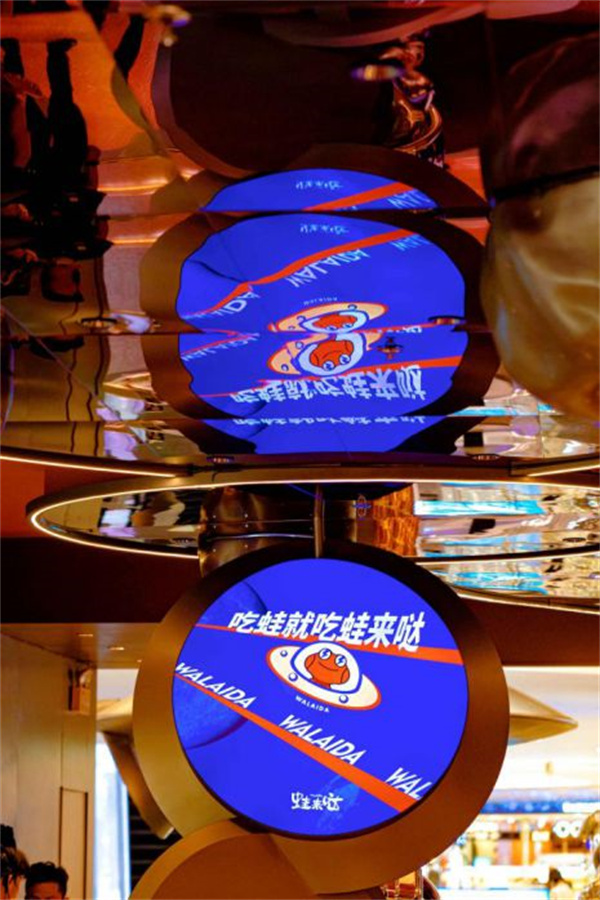 滿屏的“太空蛙”,與宇宙空間元素完美融合,仿佛置身太空,將吃蛙文化增加更多的科技感,也體現了蛙來噠“創新、開放”的品牌形象!