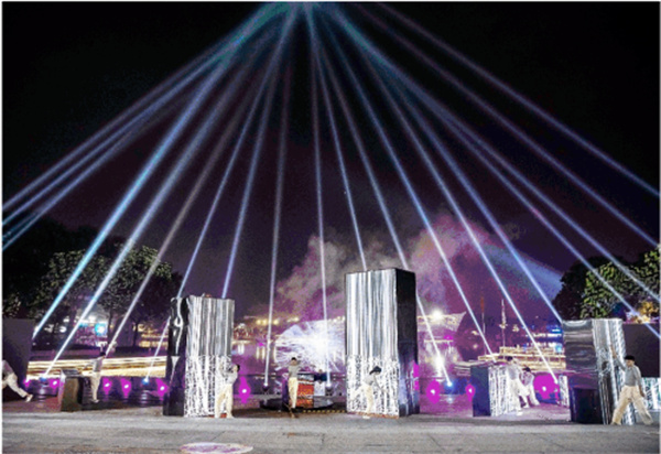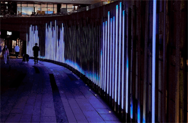 以大型裝置導入編程技術,構建全景式光影體系。大型水霧互動裝置「時空邊界」通過動態輸入技術,將信息及動態視頻以縹緲的水霧和光影的形式勾勒出輪廓。聲光互動裝置「52赫茲的鯨」導入實時環境音效,用光的線條勾勒出了聲音的波長和歡樂的形狀。