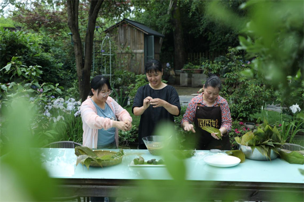 在徽州區西溪南村,溪香民宿業主張建玲和當地村民正在為製作烏飯粽和黃荊粽子做著準備,剛採摘回來的野生南燭葉被榨成汁,黃荊粉末則用清水沖泡並過濾。“烏飯是用南燭的汁,榨汁過後,用它的汁水去泡糯米,這樣子泡出的米是黃色的,但是做出來的粽子它是黑色的。黃荊粽是用黃荊的枝葉把它燒成灰,之後用它的汁泡水之後澄清,澄清的水泡米,這樣包出來的粽子特別香。”張建玲告訴记者。待糯米泡好,張建玲和村民一起開始用巧手包起徽州特色“枕頭粽”。“這兩種粽子目前的回購率特別高,很多人買過之後剛拿到手又回購,兩天就賣了一千多個”。借助電商平臺,該民宿推出的烏葉粽、黃荊棕等特色粽子走出了黃山,銷往合肥北京湖北湖南等地,深受市場歡迎。