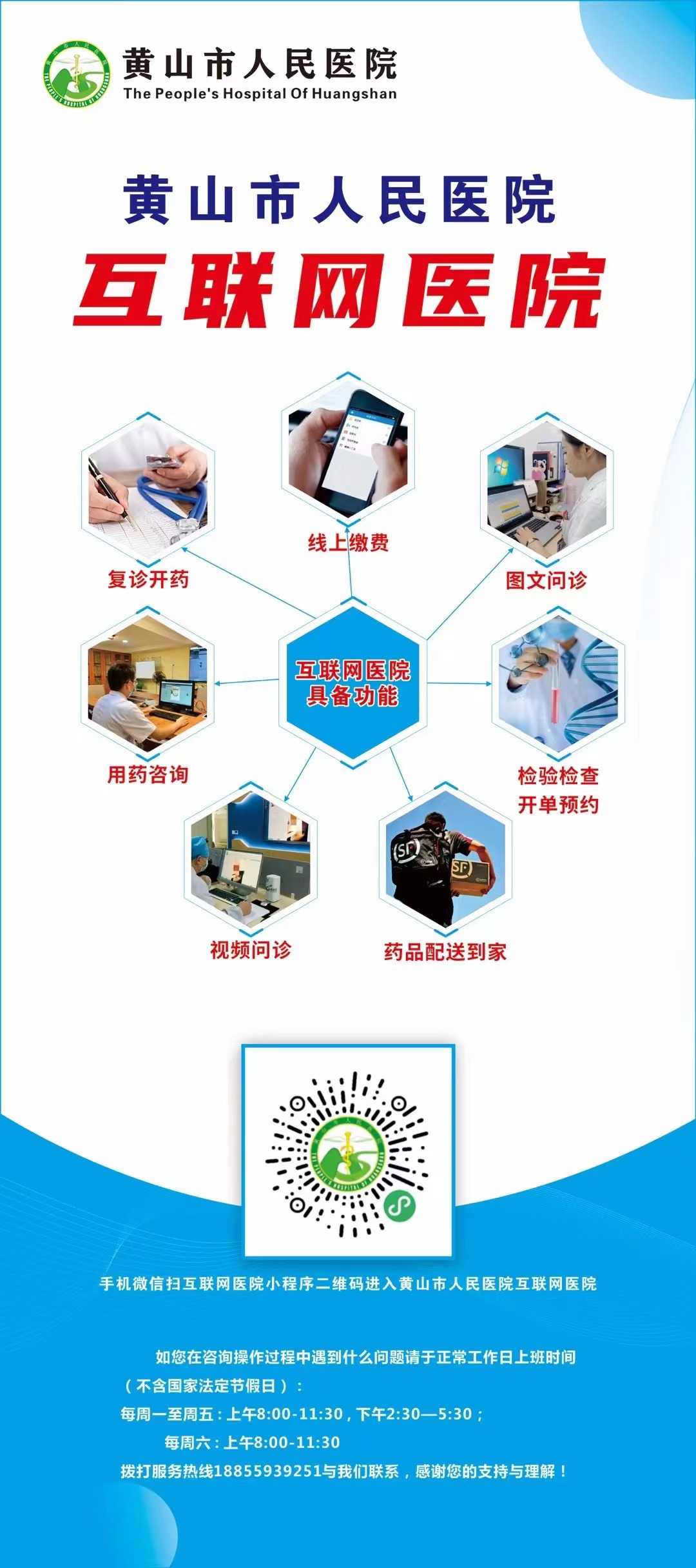 黃山市人民醫院互聯網醫院是該市首家獲得安徽省衛健委頒發運營牌照的非營利性互聯網醫院,已開通線上用藥諮詢、圖文問診、復診續方、藥品配送、醫技檢查預約等服務功能。