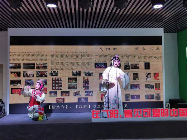 弋陽因古色而深邃,展廳展出了臉譜、布鞋、叢書、文房四寶等弋陽腔系列文創展品和明代古代民窯產品,在舞台中間可以看到演員表演弋陽腔傳統劇目。