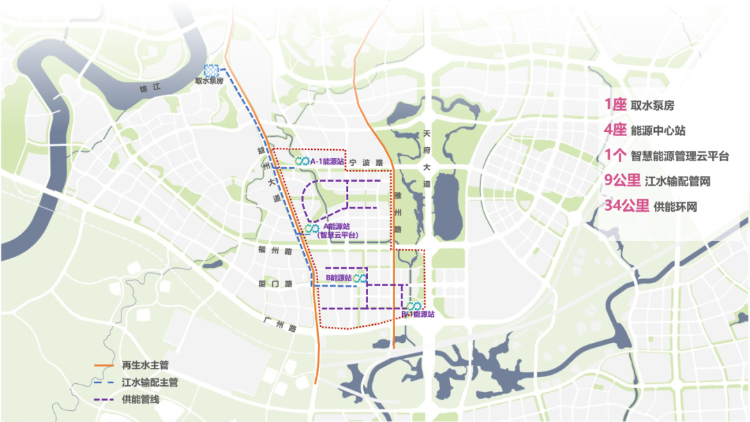 據了解,天府總部商務區西區集中供能項目位於天府公園西側,北起飛燕橫街,南至廣州路,西起益州大道,東至雅州路。項目規劃面積約2.76平方公里,總投資約8.5億元,總建築規模約459.58萬平方米,總供能面積370.88萬平方米,採用「水源熱泵(江水)+冷水機組+熱源塔熱泵+蓄能」系統供冷供熱,實現供能系統冷熱源端100%電氣化。能源站夏季供冷可再生能源裝機規模達70%以上,冬季供熱可再生能源裝機規模達100%,無任何化石能源燃燒及污染物排放,是標準的「近零碳」排放項目。