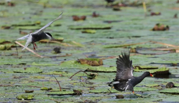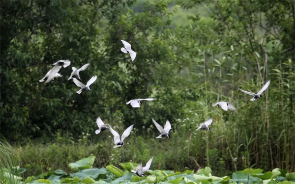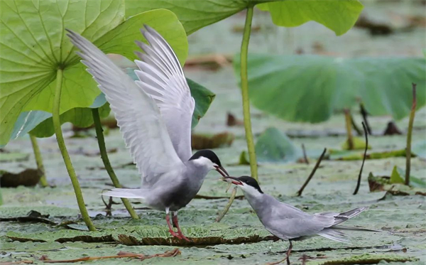 近日,位於安徽省巢湖岸邊的半島國家濕地公園裏,難以計數的須浮鷗在濕地水面上空盤旋,或銜來水草營巢,或捕來魚蝦賣力求偶,熱鬧非凡。