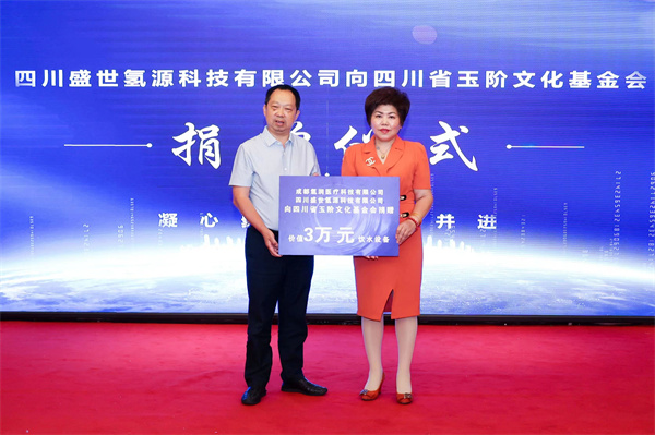 成都氫潤醫療科技有限公司禾四川盛世氫源科技有限公司向四川玉階文化基金會捐贈價值3萬產品飲水設備,該基金會黨支部副書記兼項目部部長蔡建明(左)上台接受捐贈
