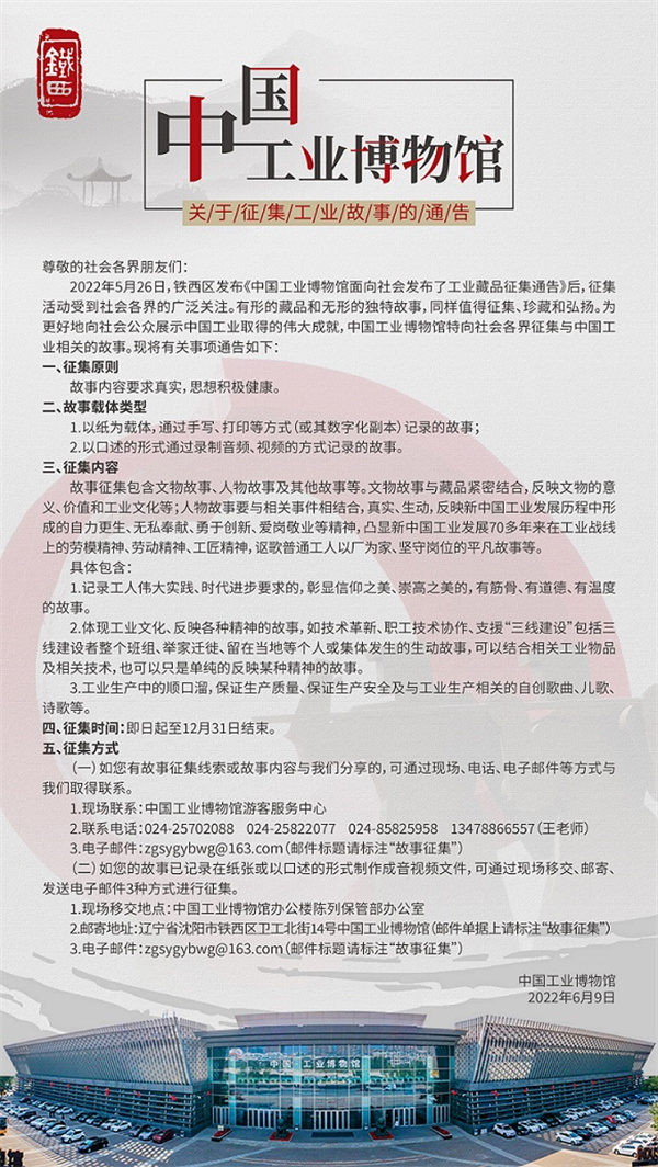 可登錄中國工業博物館微信公眾號、鐵西區人民政府網站查看《通告》。如您有故事徵集線索或故事內容與我們分享的,可通過現場、電話、電子郵件等方式與我們取得聯繫。