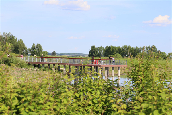 6月11日,在黑龍江省寶清縣鳥語湖公園,湖水微瀾,清脆的鳥鳴聲不絕於耳。遠處廊橋上,歡樂的人們正在合影留念;岸邊的青草地上,一家人正搭起營帳準備露營野炊;寶石河橋旁,成片的雛菊花帶蜿蜒鋪展,在微風的吹拂下搖曳生姿,美麗的姑娘和可愛的孩子們在花叢中打卡拍照,臉上洋溢着幸福的笑容……人們盡情享受着寶清縣生態建設的豐碩成果。