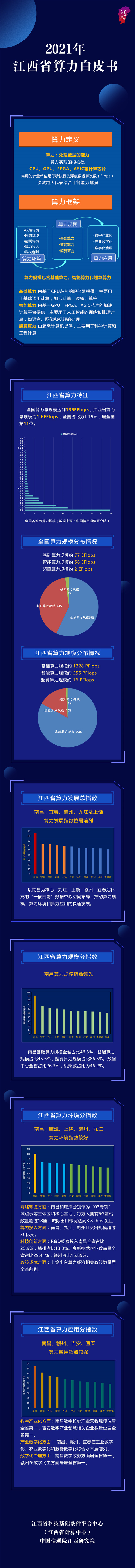 聯盟成立大會上,江西省科技基礎條件平臺中心(江西省計算中心)和中國信通院江西分院聯合首次發佈《2021年江西算力白皮書》。白皮書展示了算力發展態勢和江西省算力發展特徵,評估了全省算力發展指數。全省算力總規模為1.6EFlops,全國占比為1.19%,排全國第11位,其中全省基礎算力規模約1328 PFlops,全省占比83%,智能算力規模約 256 PFlops,占比16%,超算算力約 16 PFlops,占比1%。南昌、宜春、贛州、九江及上饒算力發展總指數居前列;南昌算力規模分指數領先;南昌、鷹潭、上饒、贛州和九江算力環境分指數較好;南昌、贛州、吉安和宜春算力應用指數較強。