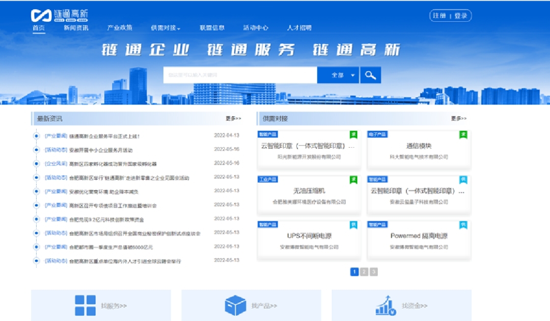 據了解,「鏈通高新企業服務平台」旨在通過「線上+線下」模式,以供需對接為核心,推動產業、產品、技術、金融、人才「五個對接」。作為合肥高新區打造「線上+線下」產業鏈全要素對接模式中的重要線上渠道之一,平台依託PC端、H5移動端以及公眾號等形式,加強高新區產業聯盟、各企業之間的交流。企業入駐平台後可以快速發佈產品、服務、需求、招聘、活動等,有效實現「五個對接」服務,促進產業鏈要素、新技術新產品線上無縫對接。