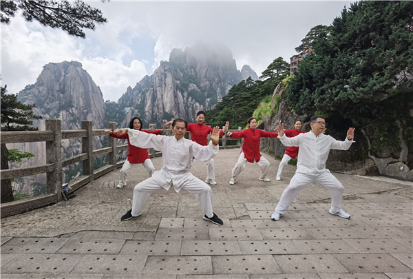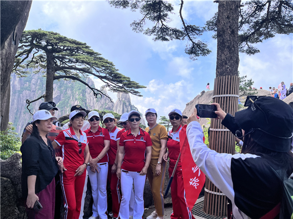 在玉屏景區,記者看見不少戴著小紅帽的團隊遊客正在導遊的帶領下有序遊覽,遊客們三五成群地在迎客松前合影留念,還有不少孩子和老人在家人的陪同下登山遊覽,公司團建遊客打著橫幅在黃山著名景點打卡紀念。還有太極愛好者在迎客松廣場打起了太極拳,遊客們在初夏黃山中盡情享受美景、記錄美好。