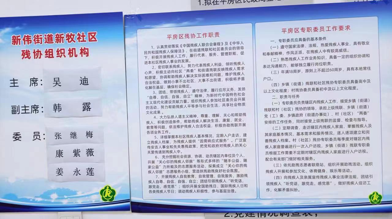 平房區殘聯依託村(社區)黨組織設立村(社區)殘協54個,鎮殘協1個,殘協專職委員55人,形成了「區殘聯—鄉(鎮)街道殘聯—村(社區)殘協」貫通聯動的區域化基層殘聯組織框架,實現了全區村(社區)殘協組織全覆蓋。已完成組織機構公示板、工作職責公示板、協會牌匾及志願者聯絡牌匾的掛牌工作。殘協組織實現了「五有:「有場地、有標識、有制度、有人員、有經費」。