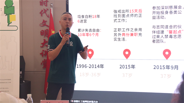 「馨起點」朋輩輔導員團隊負責人石柱,也分享了他個人是如何從一名吸毒者成長為廣東省首位有吸毒史卻成功考取助理社工師資質的禁毒社工的生命歷程,講述了他是如何在七年時間裏,從一個人到一群人,逐步搭建起廣東省第一支本土過來人禁毒志願者團隊「馨起點」的生命故事。以「馨起點」為代表的朋輩輔導服務模式已經在珠三角地區逐步推行開來,形成星火效應。