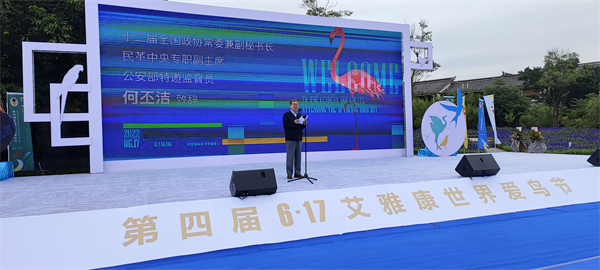 十二屆全國政協常委兼副秘書長、民革中央專職副主席、公安部特邀監督員何丕潔在活動上致辭,他說,第四屆「6.17艾雅康世界愛鳥節」由世界生態組織鳥類生態專委會主任、中國綠髮會鳥類生物多樣性保護工作委員會主任艾雅康先生倡議舉辦,主題為「天空沒有鳥,世界會變小」;相信通過此次活動,必將凝聚各界人士共同參與到保護生態、呵護鳥類的行動中來。