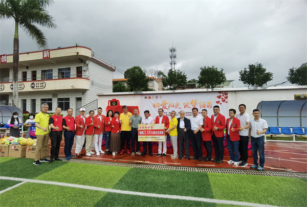 隨後,彭會長和各位領導獅友一起代表2019——2020年度助學委,桃園、獅愛足球、春天、筆架山、藍天、星火、銀湖、中天、鹽田、主會、新安、華林、地王、華僑城、聯合、藍天、仙湖、慈善收藏、弘雅服務隊各承辦協辦方為鶴鳴學校捐贈了22.5萬元善款的大支票,黃水平校長、鍾成文校長代表鶴鳴學校接受捐贈,董良田局長現場見證。獅愛足球、桃園、星火、幸福、八卦嶺服務隊和深獅公益足球俱樂部出資為鶴市鎮中心小學所轄的七所小學捐贈了4.3萬元的球衣、球靴、裝備護具和鶴鳴學校足球場的雙方替補席不鏽鋼座位以及第五屆「獅愛杯「小學生足球賽的獎盃、獎牌、獎金,加上曾雪麟球友會捐贈的30個訓練足球和聾行者公司捐贈的200條運動毛巾以及夢圓綠茵青訓機構捐贈的公益培訓課程,總計此次足球助學活動共捐贈現金物資課程折合愛心善款5.4萬元。