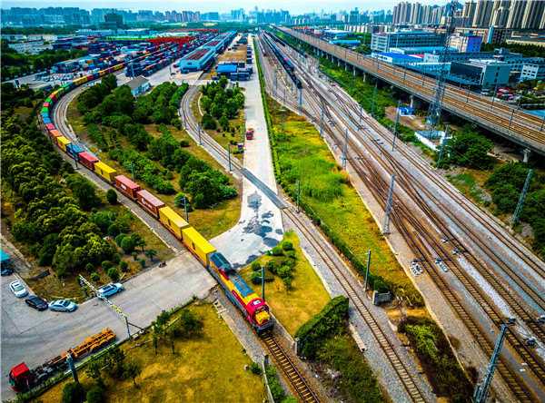 6月24日,一列滿載貨物發往歐洲地區的合肥中歐班列從合肥北站物流基地駛出(無人機照片)
