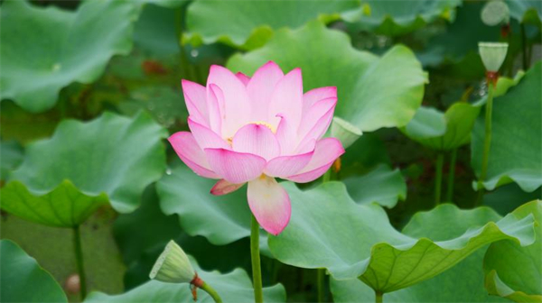 沿着池塘邊的小道一直向前,映入眼帘的是盛放的荷花和綠油油的荷葉,特別是站在池塘中的一座亭子上放眼望去,有的花瓣全開露出金黃色的花蕊和嫩黃色蓮蓬,有的含苞待放,有的已經變成綠色的蓮蓬。