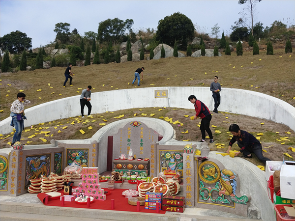 第二天清早,各人先乘坐大巴抵達潮陽靈山寺,由於山路狹窄須轉乘預約小客車上山。按照祭祀次序,先到祖父母墓地,然後再到父母親墓地拜祭。傳統舊俗父親不在,長子便是家庭代表,接下來,由兄長將刻在墓碑字重新上色,先用綠色油漆填寫先人姓名,而紅色油漆用於其他字迹上,同時在碑石頂壓上紙錢,並將紙錢撒於墓地範圍四周。