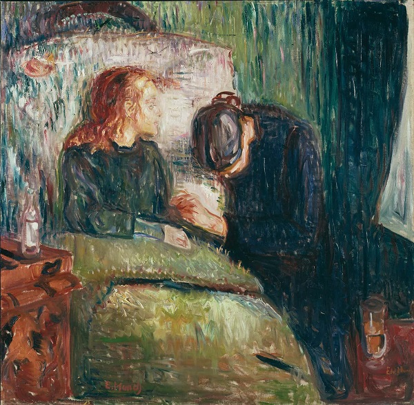 在作品《嫉妒》中,作家Stanisław Przybyszewski位于画面前景,一名女子在其身后,这名女子被认为是Dagny Juel,此外还有一个男人背朝作家。Juel被认为同蒙克有一段恋爱关系,在此之后,她和Przybyszewski拥有一段短暂的婚姻。蒙克年轻时,他的母亲死于结核病,他的姐姐也死于疾病。作品《病孩》即描绘了这一回忆,在这场展览中,观众能够看到三个版本的《病孩》,巴特拉姆评价蒙克“完全流露了姐姐去世时的情感”。巴特拉姆表示,作品1892年在柏林展出时引发了丑闻,因为当时人们并不习惯再现死亡时的痛苦。那个展览在一周内便被迫结束,与此同时,作品在艺术先锋中获得了肯定。