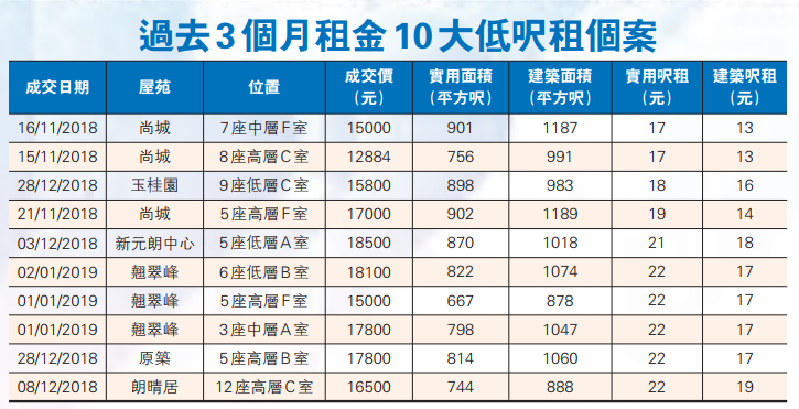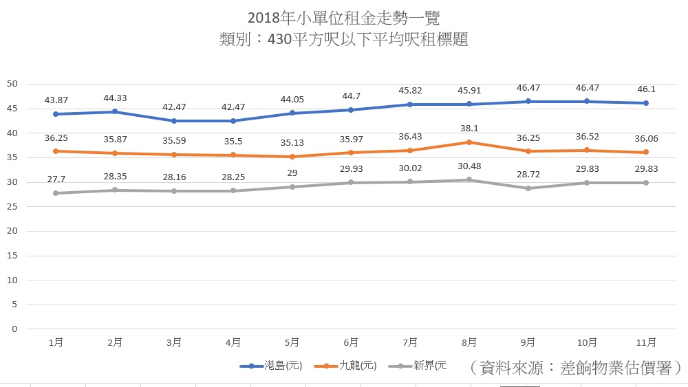 上一次租金向下調整,要追溯到2015年10月份。當時租金同樣結束連續4個月創歷史新高的局面,連跌6個月,累跌共10.9%。現時租金連跌4個月僅跌5.0%,跌幅相對溫和。新界的主要藍籌屋苑,包括沙田第一城跌0.2%及嘉湖山莊跌0.4%。差餉物業估價署數據顯示,新界地區435平方呎以下的單位,2018年1月至11月,租金升幅最急,11月份平均租金較1月平均租金,升了7.7%。
