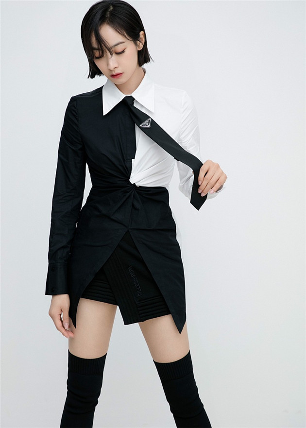 宋茜的这身黑白配的短裙造型是不是酷出天际?!原来女神单手拎起领带的瞬间也能这么撩~不过这份酷帅也要归功于黑色款领带。