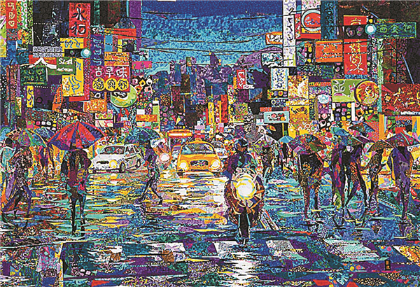 作品《繁華雨夜 Rainy Night》將台灣逢甲夜市熱鬧人物場景刻畫得淋漓盡致。