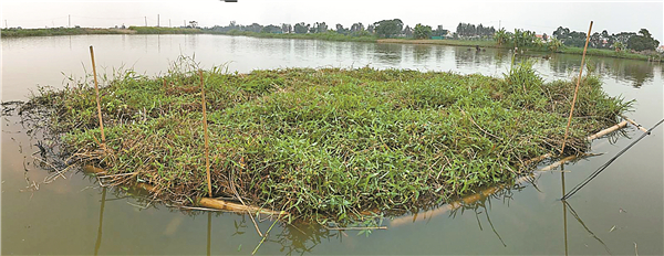 何遠良的《大生浮島》用竹和塘邊草搭建而成,可供魚塘各種動物棲息。