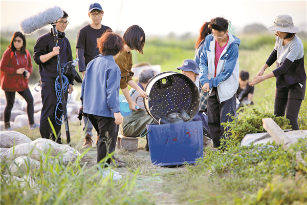 馬智恆跟香港兆基創意書院的學生在魚塘拍攝短片《候鳥》,講述孫女與漁民爺爺的故事。 圖片由香港觀鳥會提供