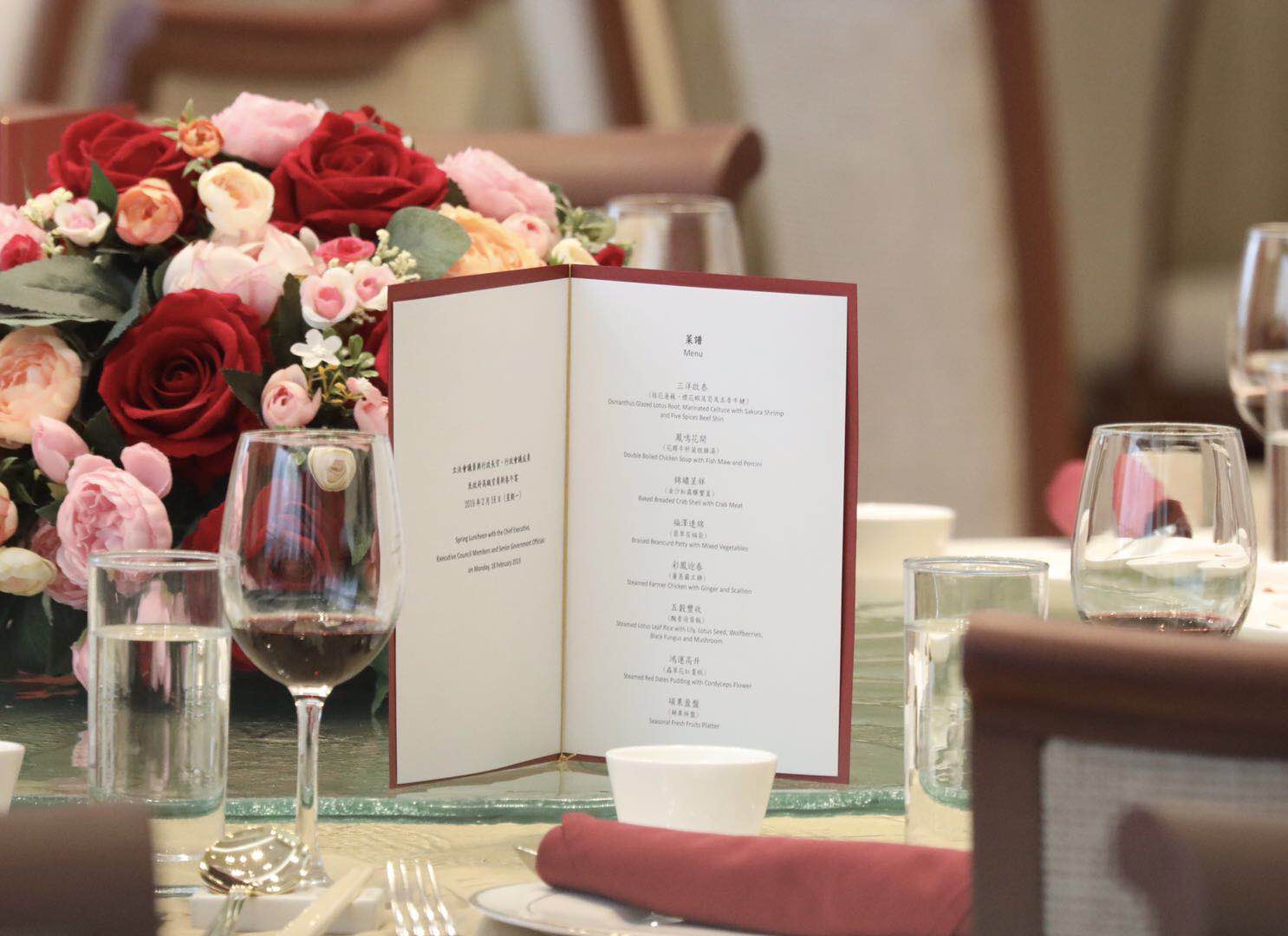 記者從宴會台的菜譜上看到,菜譜上一共列有八個菜式,分別為三洋啟泰(桂花蓮藕、櫻花蝦萵筍及五香牛腱)、鳳鳴花開(花膠牛肝菌燉鷄湯)、錦繡呈祥(金沙松露釀蟹蓋)、福澤連綿(翡翠百福袋)、彩鳳迎春(薑葱霸王雞)、五穀豐登(飄香荷葉飯)、鴻運高升(蟲草花紅棗糕)、碩果盈盤(鮮果拼盤)。從菜名來看,著實充滿了新春的喜慶氣氛。